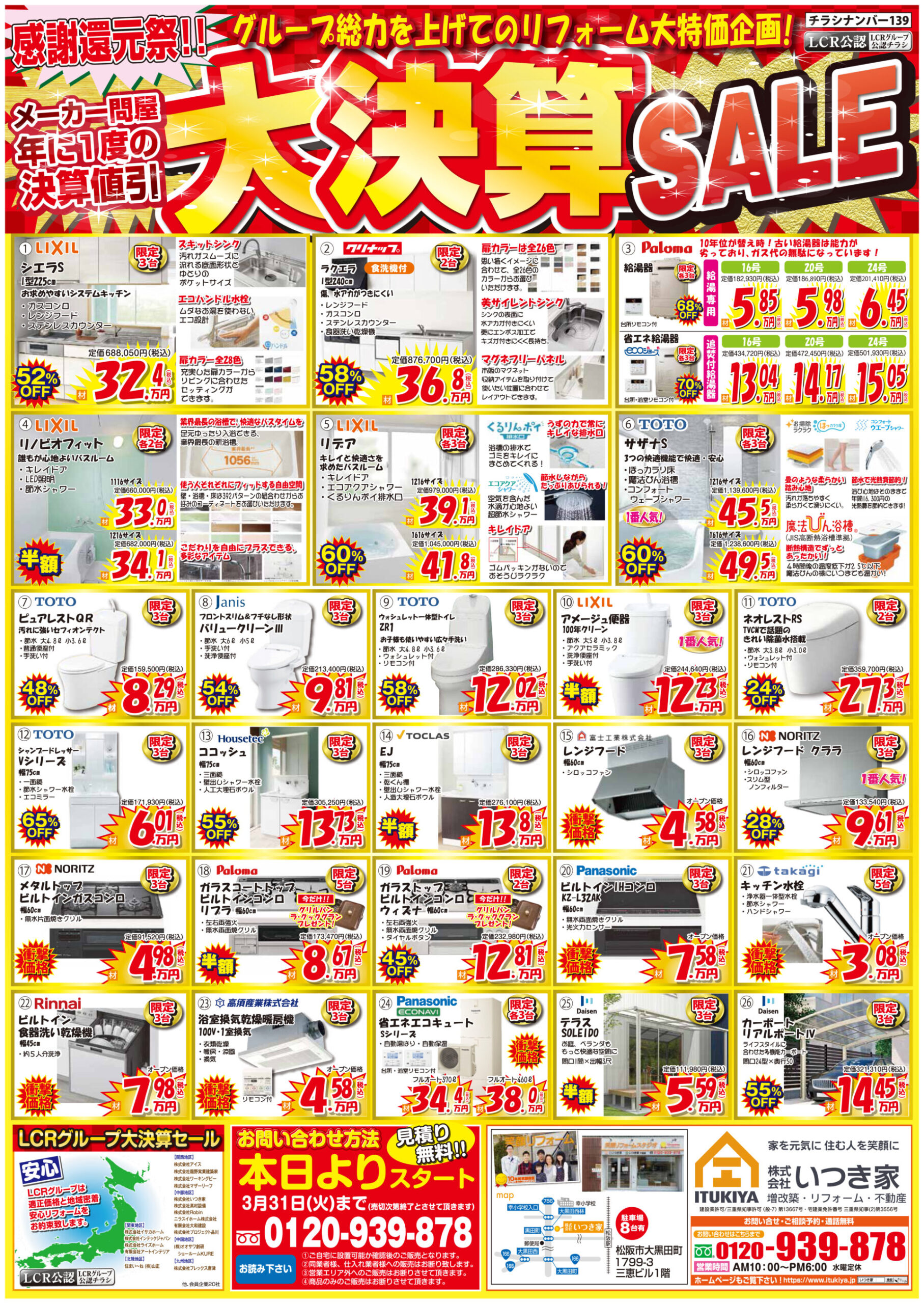 年に一度の大決算SALE!<見積無料><相談無料> 2026年03月14日 年に一度の大決算SALE開催中! ✨ 気になる商品がありましたら、今すぐお問い合わせください! 「チラシNo.139を見た」と伝えていただくとスムーズです♪ お知らせ イベントリフォーム不動産ご相談塗り替え増改築外壁塗装松阪リフォーム水廻りリフォーム ツイート シェア はてブ pocket LINE リフォーム応援SALE!<見積無料><相談無料> 前へ 一覧へ 次へ Related posts: リフォーム応援セール!<見積無料><相談無料> リフォーム応援セール!<見積無料><相談無料> 歳末リフォームSALE!<見積無料><相談無料> リフォーム応援SALE!<見積無料><相談無料>